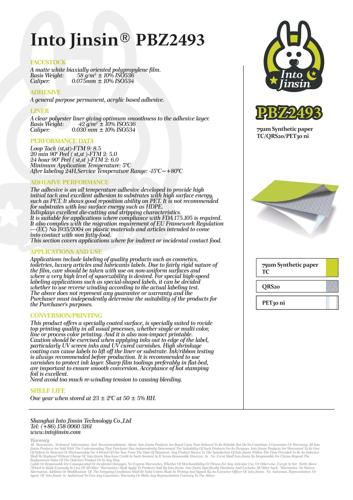 Facestock: Polypropylene Film (Matte White Biaxially Oriented Three-Ply Synthetic Paper)